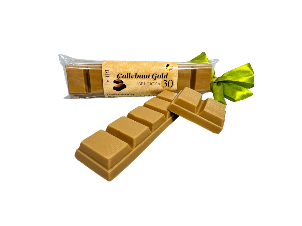 SLOŽENÍ: bílá čokoláda Gold 30% (kak. máslo, cukr, sušené pln. mléko, laktóza, suš. syrovátka, suš. odstředěné mléko, karamelizovaný cukr (2%), sojový lecitin, přírodní vanilkové aroma, sůl)