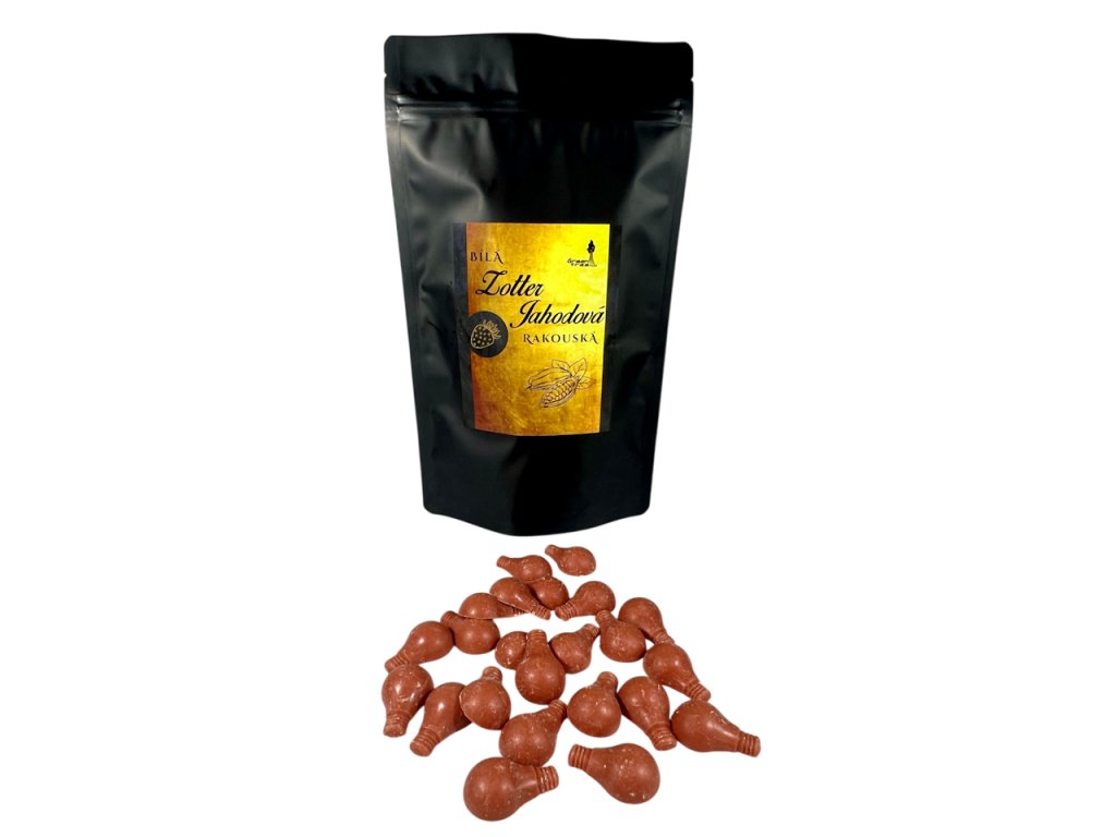 SLOŽENÍ: bílá čokoláda Zotter (surový třtinový cukr, kakaové máslo, sušené jahody (12 %), sušené odstředěné mléko, nekrystalizovaný třtinový cukr, sójový lecitin, citrónový prášek (citrónová šťáva z koncentrátu, kukuřičný škrob, cukr), vanilkový prášek, sůl)