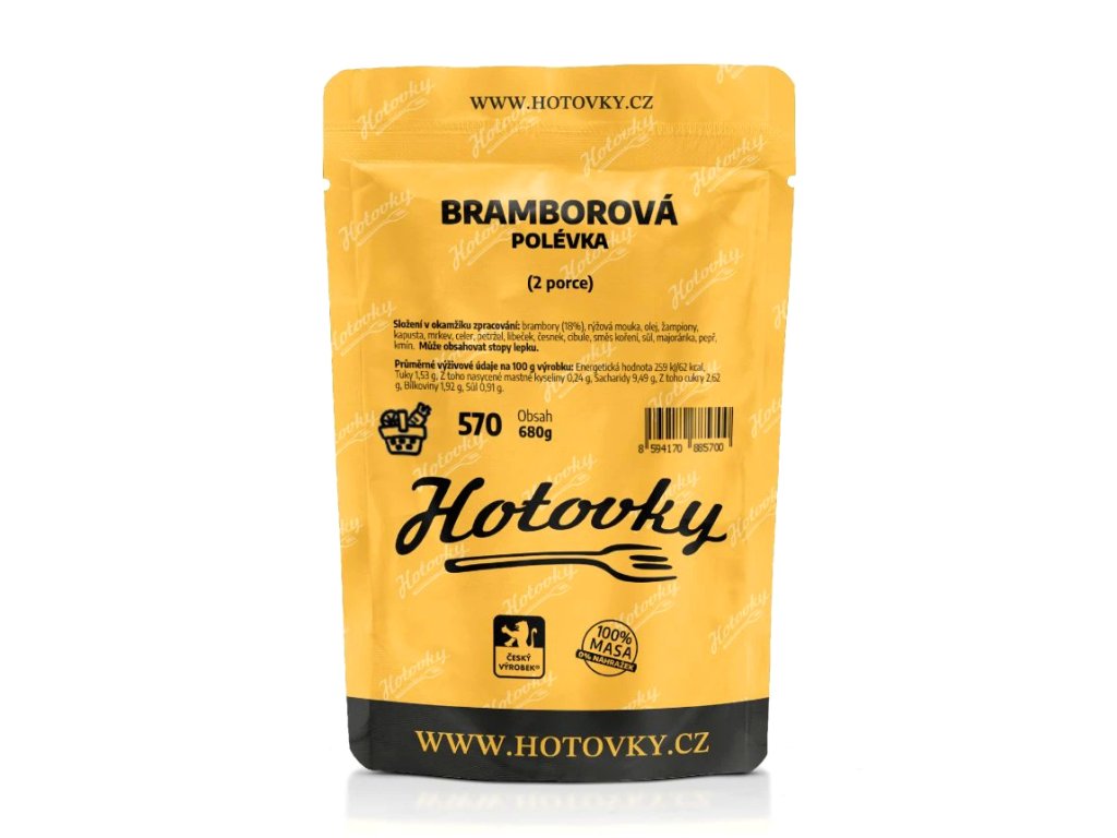 Složení v okamžiku zpracování: brambory (18%), rýžová mouka, olej, žampiony, kapusta, mrkev, celer, petržel, libeček, česnek, cibule, směs koření, sůl, majoránka, pepř, kmín. Může obsahovat stopy lepku.
