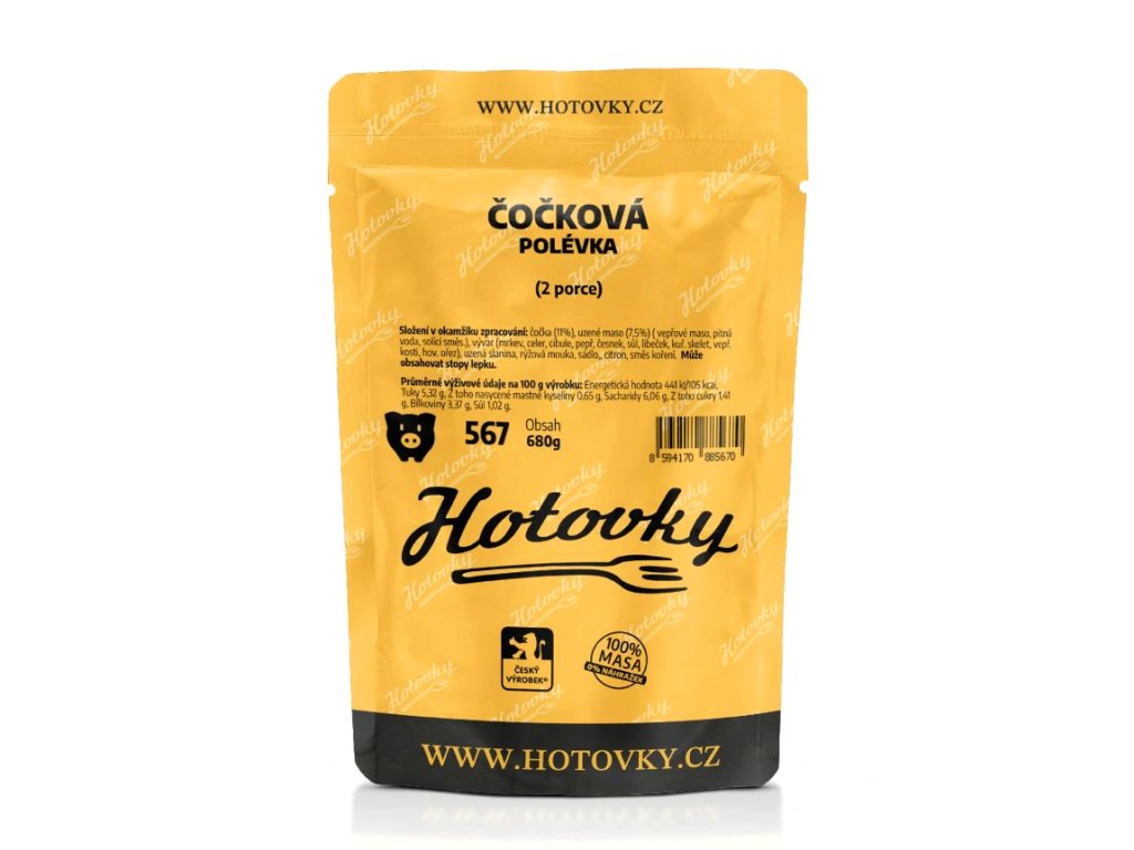 Složení v okamžiku zpracování: čočka (11%), uzené maso (7,5%) ( vepřové maso, pitná voda, solící směs), vývar (mrkev, celer, cibule, pepř, česnek, sůl, libeček, kuř. skelet, vepř. kosti, hov. ořez), uzená slanina, rýžová mouka, sádlo, citron, směs koření. Může obsahovat stopy lepku.