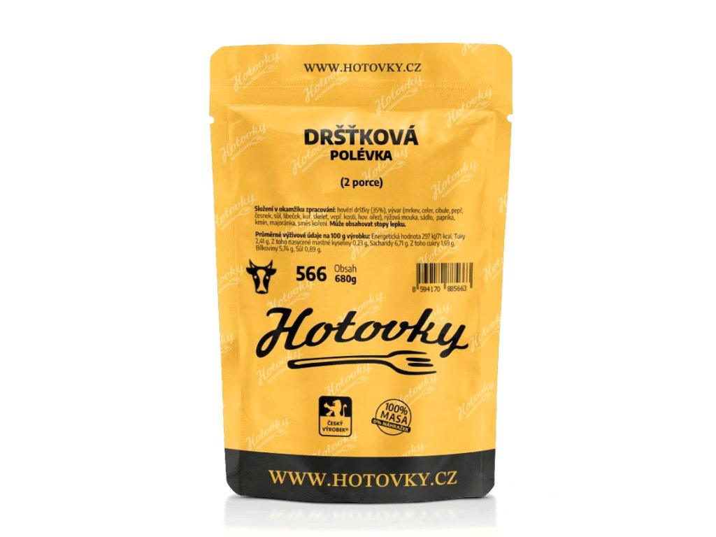 Složení v okamžiku zpracování: hovězí dršťky (35%), vývar (mrkev, celer, cibule, pepř, česnek, sůl, libeček, kuř. skelet, vepř. kosti, hov. ořez), rýžová mouka, sádlo, paprika, kmín, majoránka, směs koření. Může obsahovat stopy lepku.