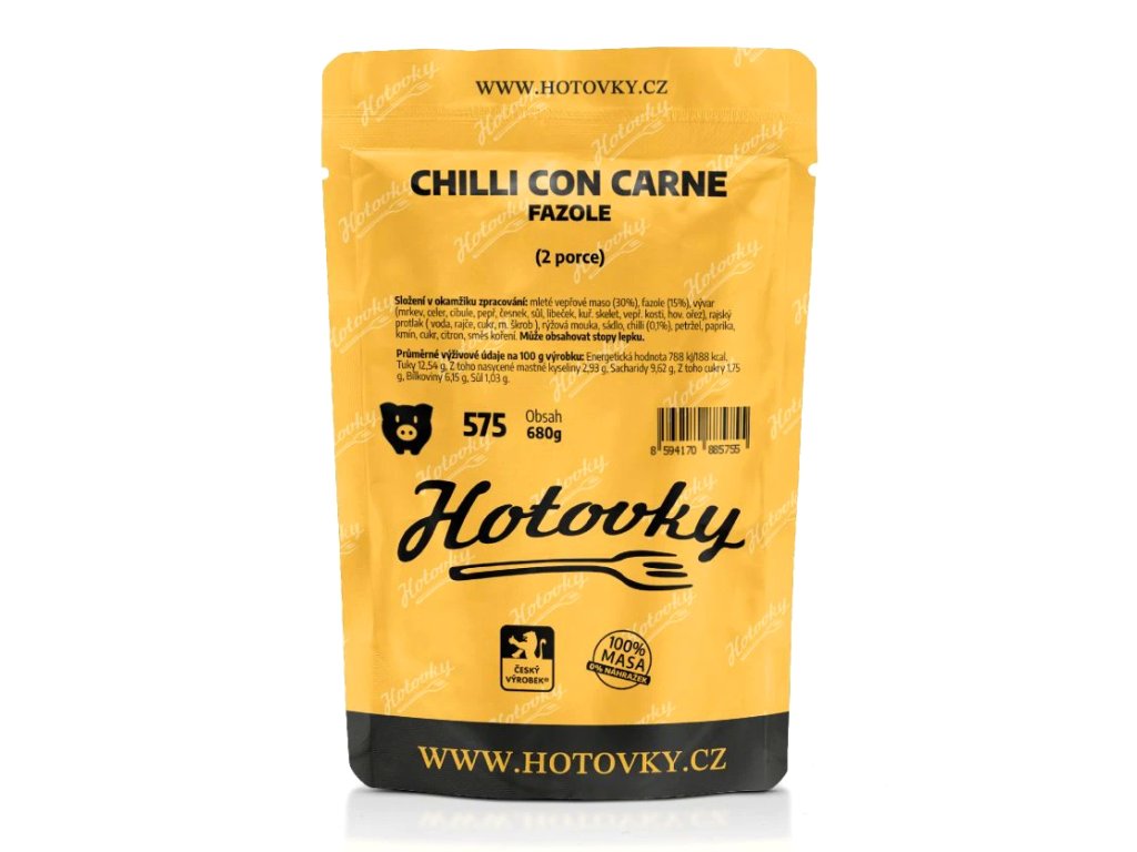 Složení v okamžiku zpracování: mleté vepřové maso (30%), fazole (15%), vývar (mrkev, celer, cibule, pepř, česnek, sůl, libeček, kuř. skelet, vepř. kosti, hov. ořez), rajský protlak ( voda, rajče, cukr, m. škrob ), rýžová mouka, sádlo, chilli (0,1%), petržel, paprika, kmín, cukr, citron, směs koření. Může obsahovat stopy lepku.
