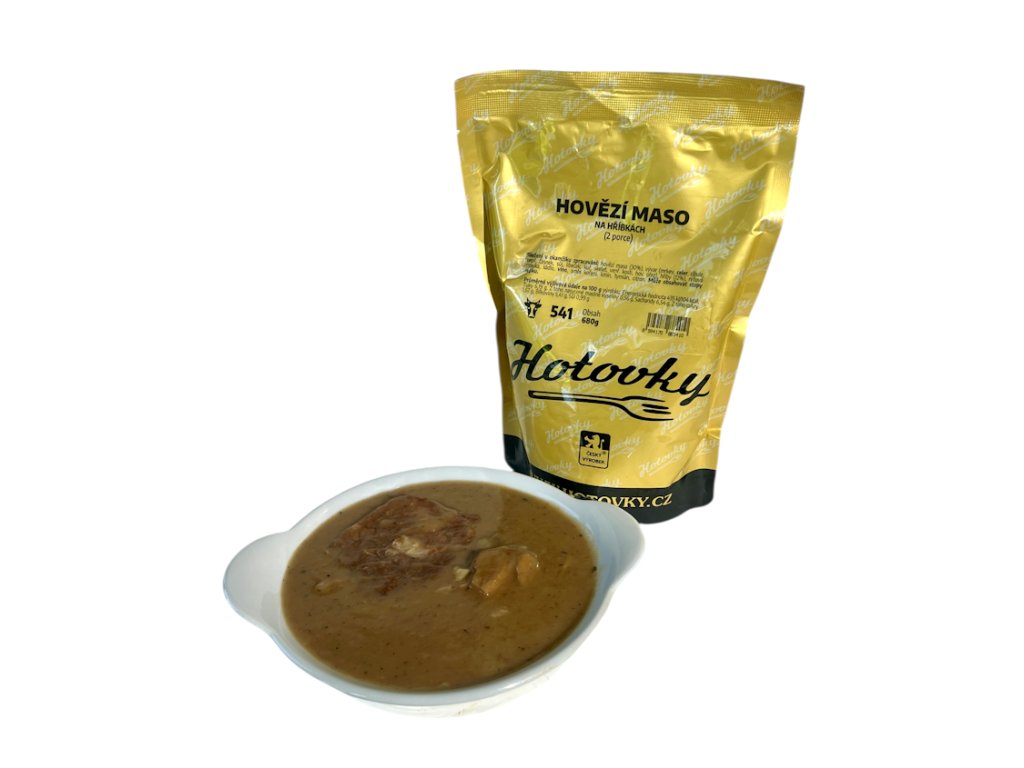 Složení v okamžiku zpracování: hovězí maso (30%), vývar (mrkev, celer, cibule, pepř, česnek, sůl, libeček, kuř. skelet, vepř. kosti, hov. ořez), hřiby (12%), rýžová mouka, sádlo, víno, směs koření, kmín, tymián, citron. Může obsahovat stopy lepku.