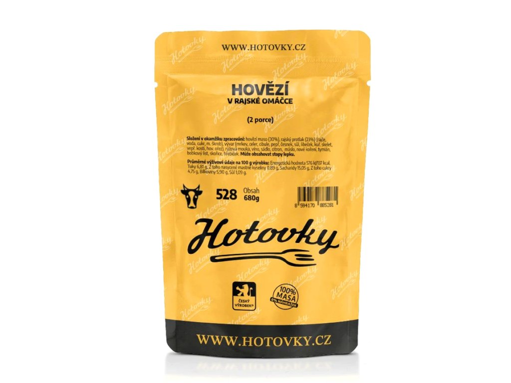 Složení v okamžiku zpracování: hovězí maso (30%), rajský protlak (23%) (rajče, voda, cukr, m. škrob), vývar (mrkev, celer, cibule, pepř, česnek, sůl, libeček, kuř. skelet, vepř. kosti, hov. ořez), rýžová mouka, víno, sádlo, citron, máslo, nové koření, tymián, bobkový list, skořice, hřebíček. Může obsahovat stopy lepku.