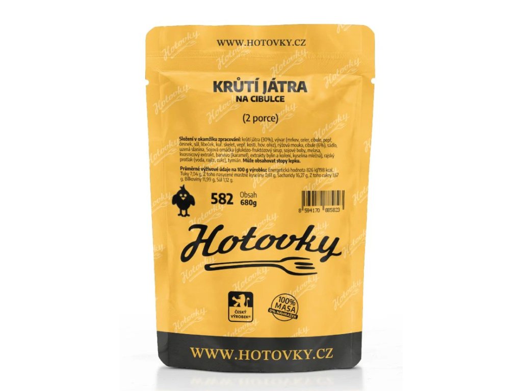 Složení v okamžiku zpracování: krůtí játra (30%), vývar (mrkev, celer, cibule, pepř, česnek, sůl, libeček, kuř. skelet, vepř. kosti, hov. ořez), rýžová mouka, cibule (6%), sádlo, uzená slanina, Sojová omáčka (glukózo-fruktózový sirup, sojové boby, melasa, kvasnicový extrakt, barvivo (karamel), extrakty bylin a koření, kyselina mléčná), rajský protlak (voda, rajče, cukr), tymián. Může obsahovat stopy lepku.