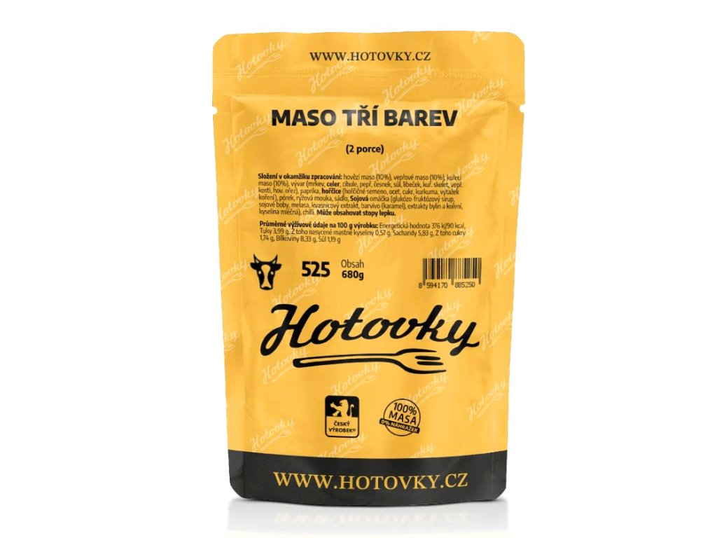 Složení v okamžiku zpracování: hovězí maso (10%), vepřové maso (10%), kuřecí maso (10%), vývar (mrkev, celer, cibule, pepř, česnek, sůl, libeček, kuř. skelet, vepř. kosti, hov. ořez), paprika, hořčice (hořčičné semeno, ocet, cukr, kurkuma, výtažek koření), pórek, rýžová mouka, sádlo, Sojová omáčka (glukózo-fruktózový sirup, sojové boby, melasa, kvasnicový extrakt, barvivo (karamel), extrakty bylin a koření, kyselina mléčná), chilli. Může obsahovat stopy lepku.