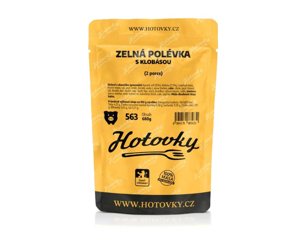 Složení v okamžiku zpracování: kysané zelí (15%), klobása (7,5%), ( vepřové maso, hovězí maso, sůl, pepř, kmín, česnek, voda.), vývar (mrkev, celer, cibule, pepř, česnek, sůl, libeček, kuř. skelet, vepř. kosti, hov. ořez), brambor, rýžová mouka, sádlo, smetana, uzená slanina, směs koření, m. kukuřičný škrob, cukr, paprika. Může obsahovat stopy lepku.