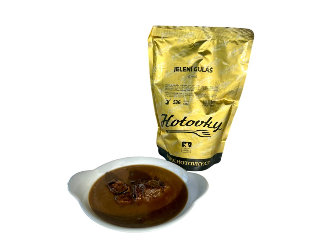 Složení v okamžiku zpracování: jelení maso (30%), vývar (mrkev, celer, cibule, pepř, česnek, sůl, libeček, kuř. skelet, vepř. kosti, hov. ořez), rýžová mouka, uzená slanina, sádlo, rajský protlak ( voda, rajče, cukr, m. škrob ), víno, tymián, rozmarýn, jalovec, paprika. Může obsahovat stopy lepku.