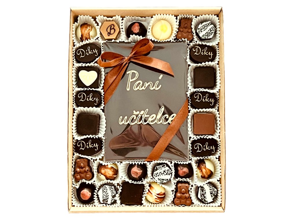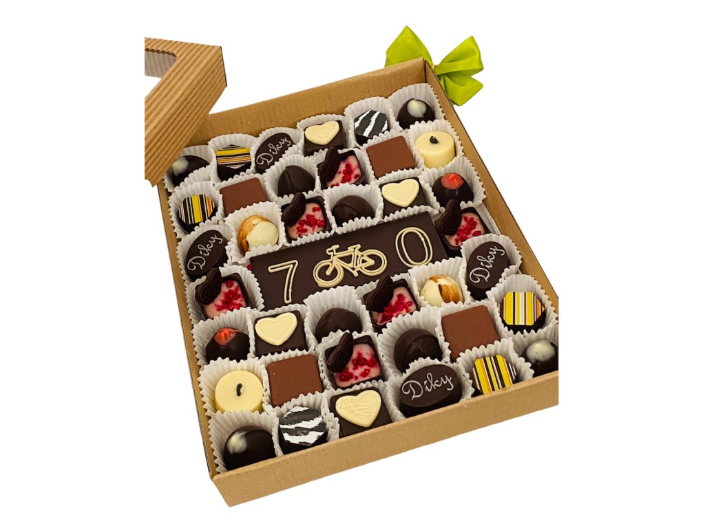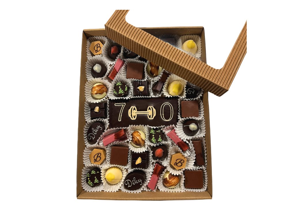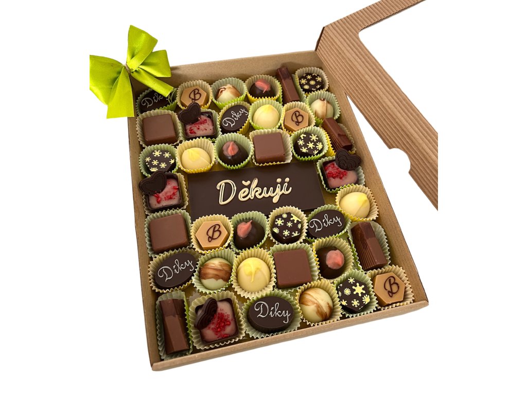 Kolekce 36-38 pralinek (podle velikosti), doplněná „čokoládovým přáním“, tedy tabulkou čokolády s textem na kterém se můžeme domluvit ( bez diakritiky :-), ostatně stejně jako na obsahu. Bonboniéra je určena pro skutečné mlsouny nebo jako skvělý netradiční narozeninový dárek.