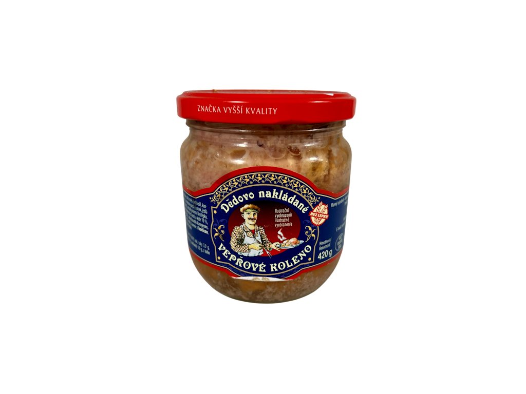 Složení: vepřové koleno bez kosti a kůže 294g, vepřové kůže 34g, voda, zahušťovadlo karagenan, prášek z červené řepy, extrakty koření, koření s hořčicí, dextróza, látka zvýrazňující chuť a vůni glutaman sodný, solicí směs (jedlá sůl, konzervant E250)
