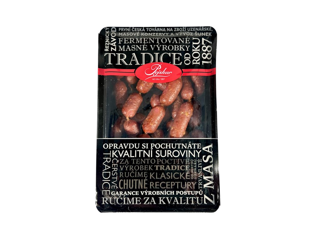 Vepřové maso, hovězí maso, vepřové sádlo, jedlá sůl, koření, konzervant E 250, stabilizátor E 450, antioxidanty E 575, E 300, E 326, dextróza, škrob, česnek, barvivo E 120, jedlé kolagenní střevo. Na 100g výrobku bylo použito 156g masa.