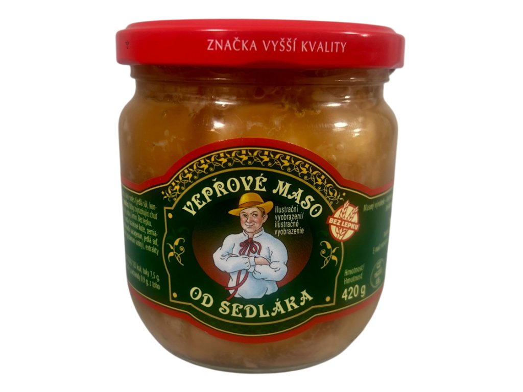 | Sůl | 1,5 | Vepřová plec 75 %# voda# vepřové kůže# bramborový škrob# sůlicí směs (jedlá sůl# konzervant E250)# zahušťovadlo karagenan# jedlá sůl# hroznový cukr# koření s hořčicí# látky zvýrazňující chuť a vůni (glutaman sodný)# extrakty koření# česneková pasta (česnek# jedlá sůl# voda)# kmín Bez lepku |