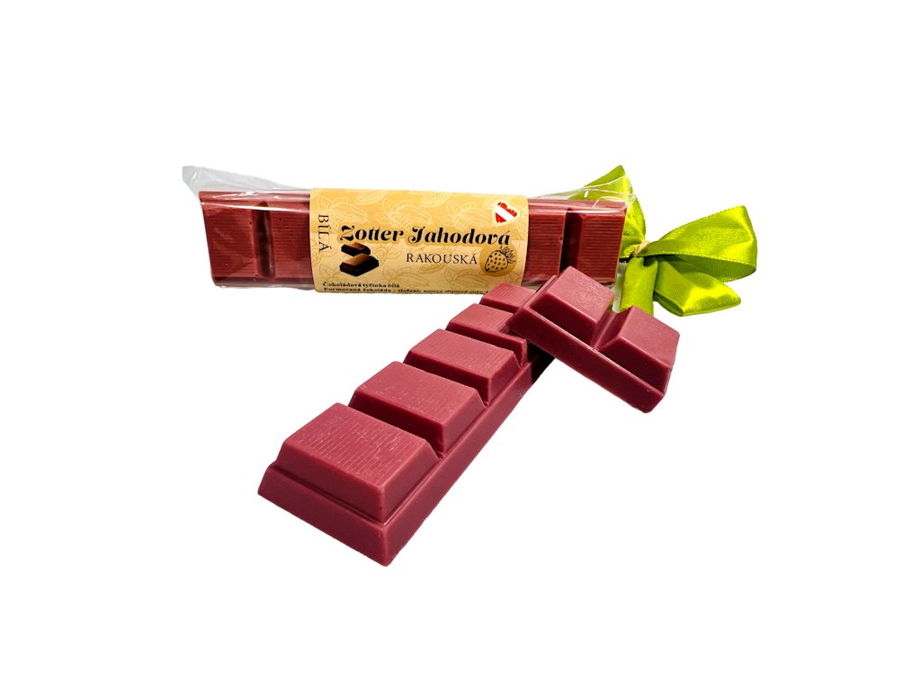 SLOŽENÍ: bílá čokoláda Zotter (surový třtinový cukr, kakaové máslo, sušené jahody (12 %), sušené odstředěné mléko, nekrystalizovaný třtinový cukr, sójový lecitin, citrónový prášek (citrónová šťáva z koncentrátu, kukuřičný škrob, cukr), vanilkový prášek, sůl)